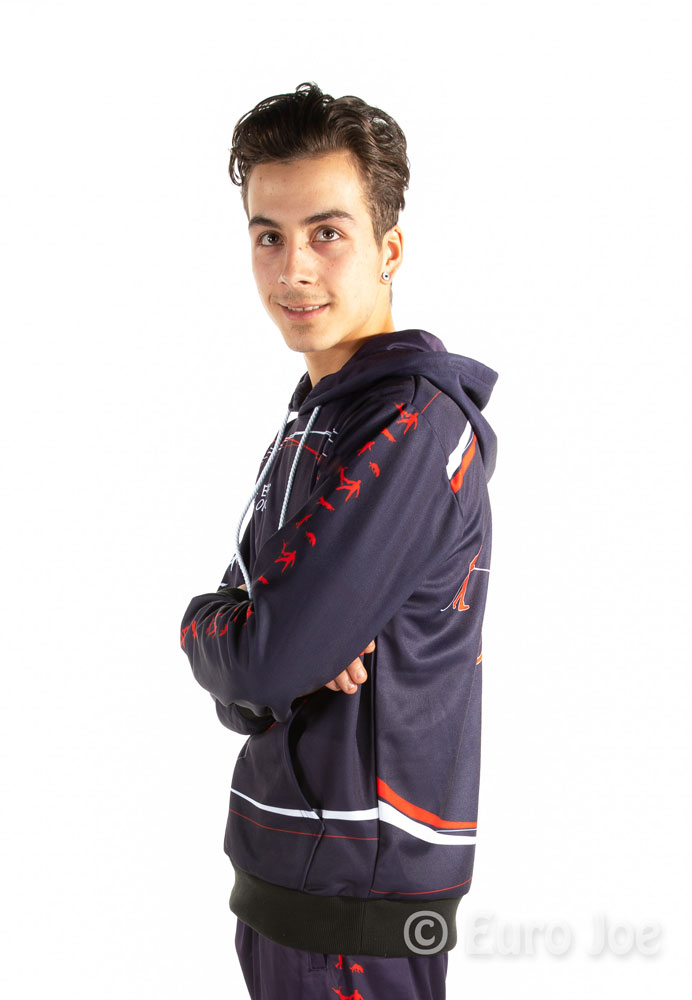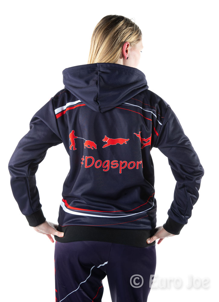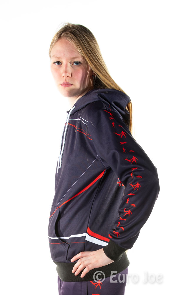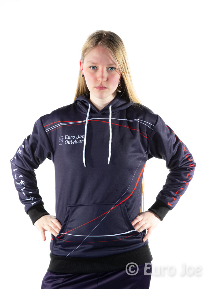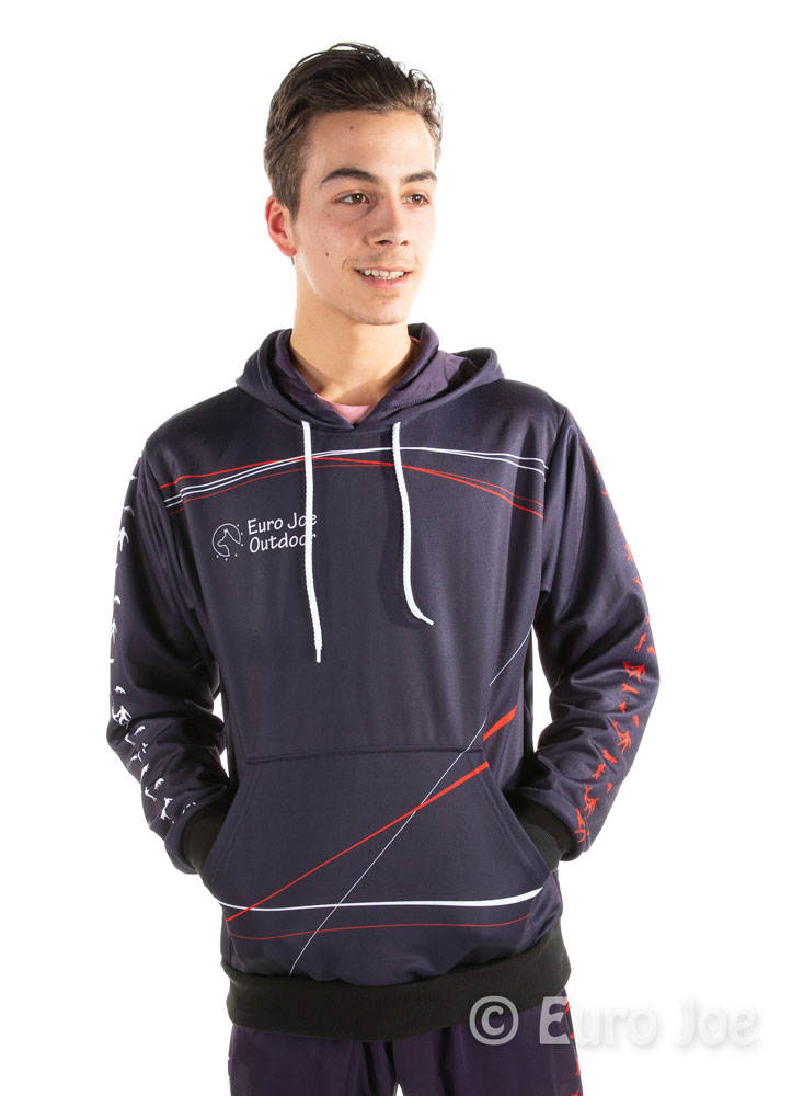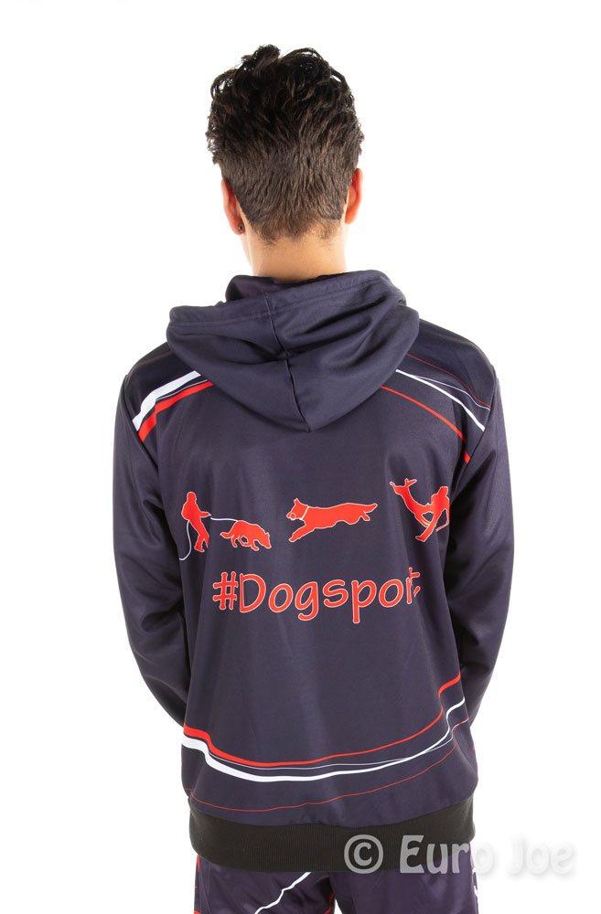 Hoody in blue basic color, with red and white lines and drawings.