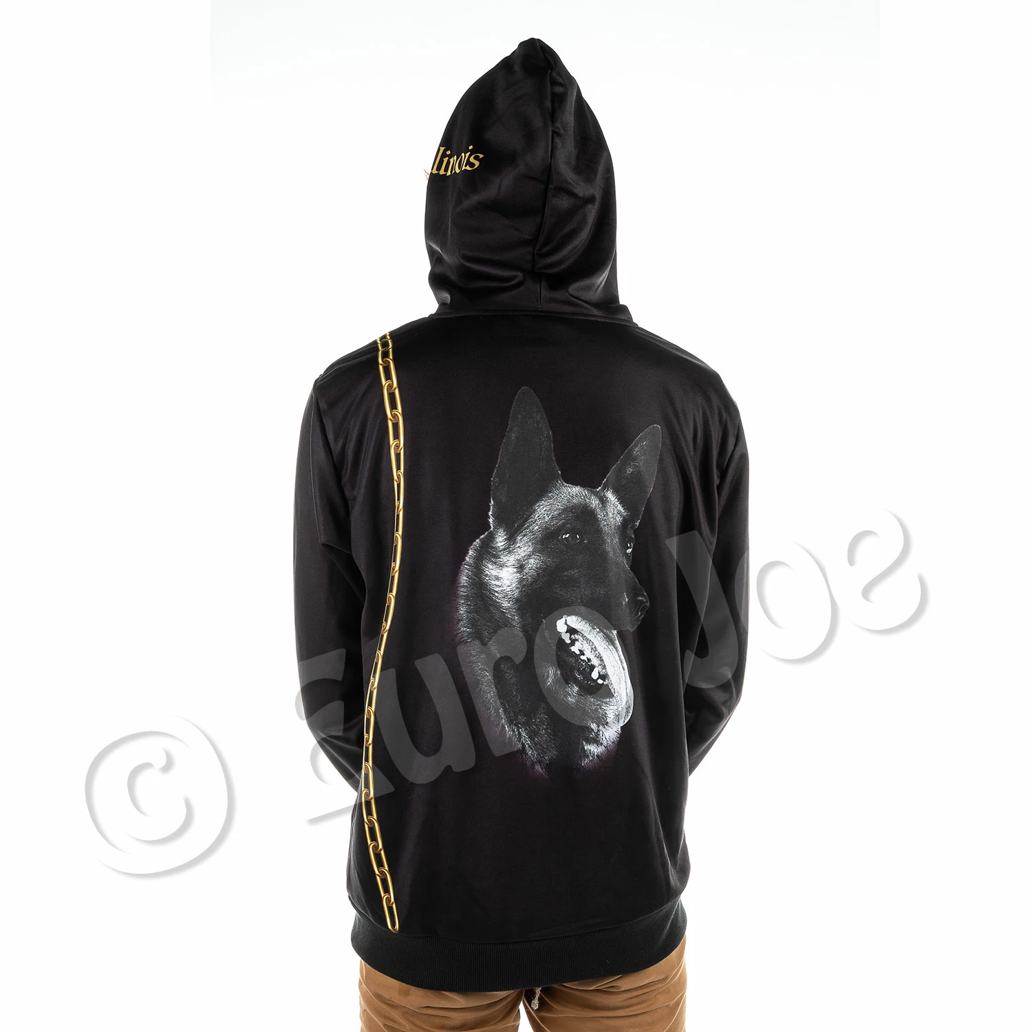 Hoody in black basic color, with a large image of a Malinois head on the back. On the chest is the same image in miniature.