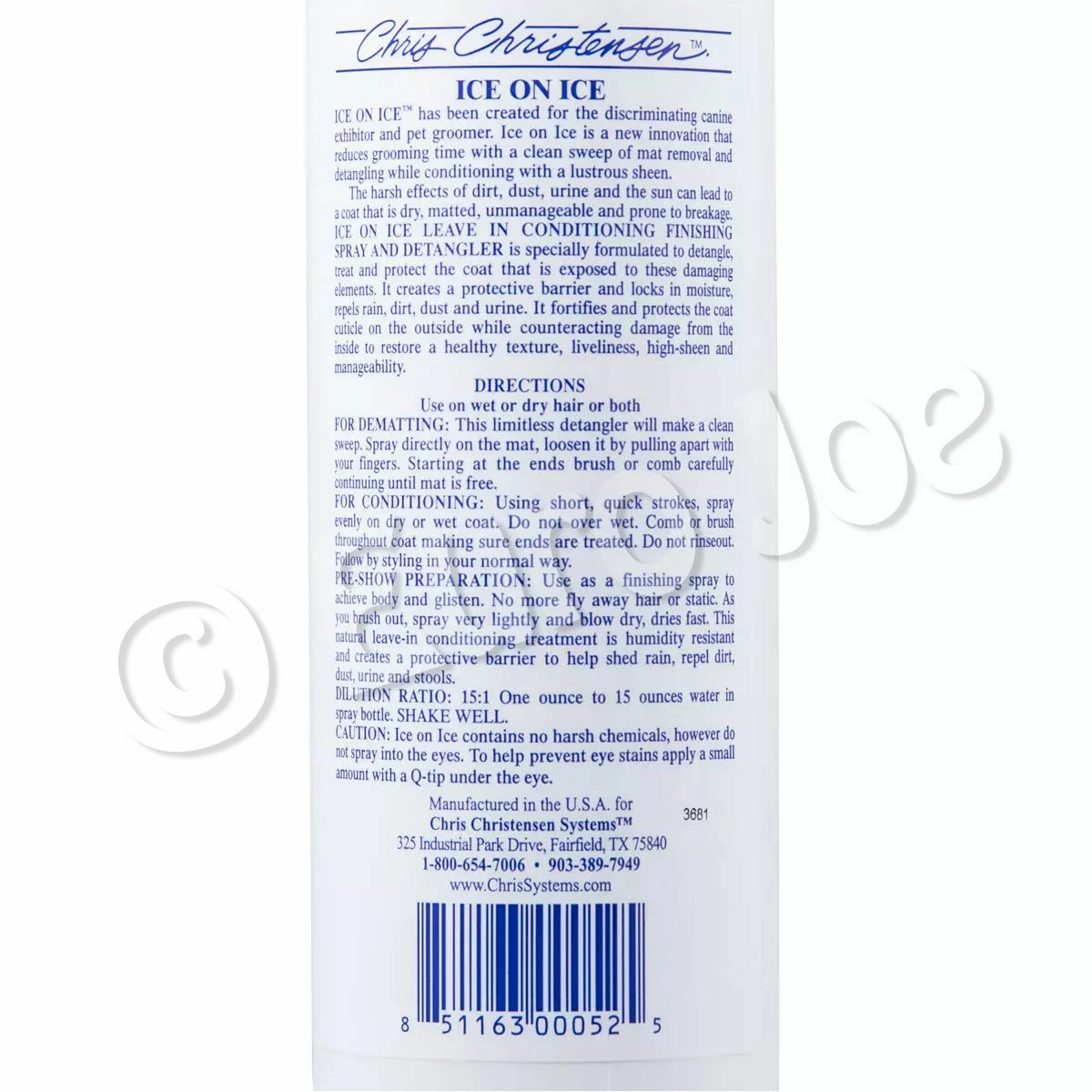 Ice on Ice Detangling and Finishing Spray repels dirt, dust, urine, and pollutants that damage and break the coat. Ice on Ice is water-soluble and can be added to final rinse. Adds elasticity and strength to the coat when brushing and protects the coat from damaging UV rays.