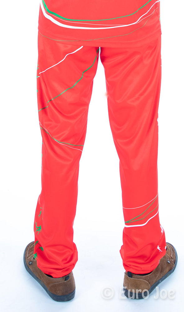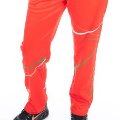 Training pants in red basic color, with white and green lines and drawings.