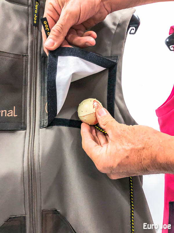 The chest pockets are partly formed by Velcro, which makes it easy to open them to quickly drop the ball or other reward at the appropriate moment.