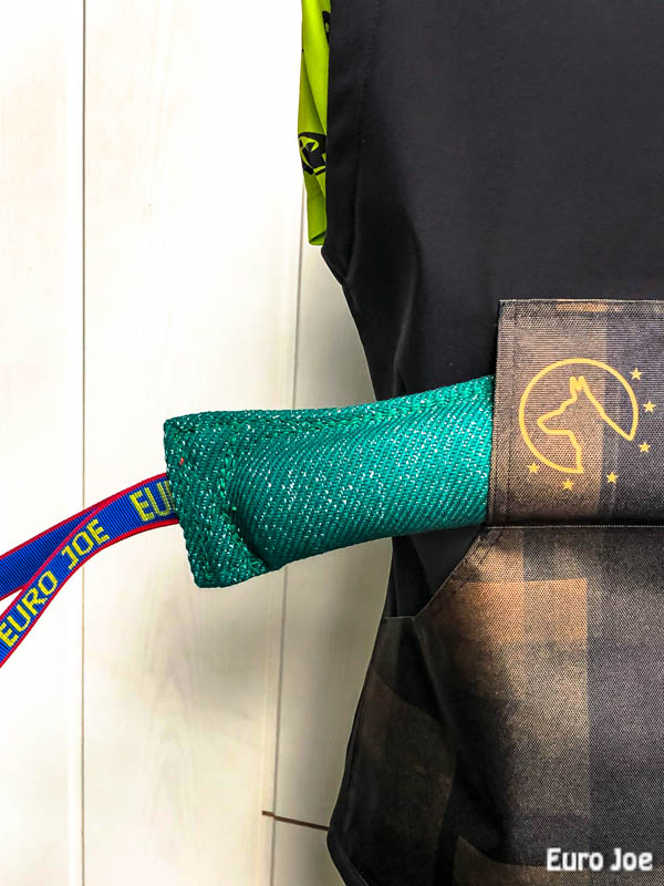 On the back you will find a large pocket at the bottom with a horizontal pocket above that is ideal for storing a bite tug.